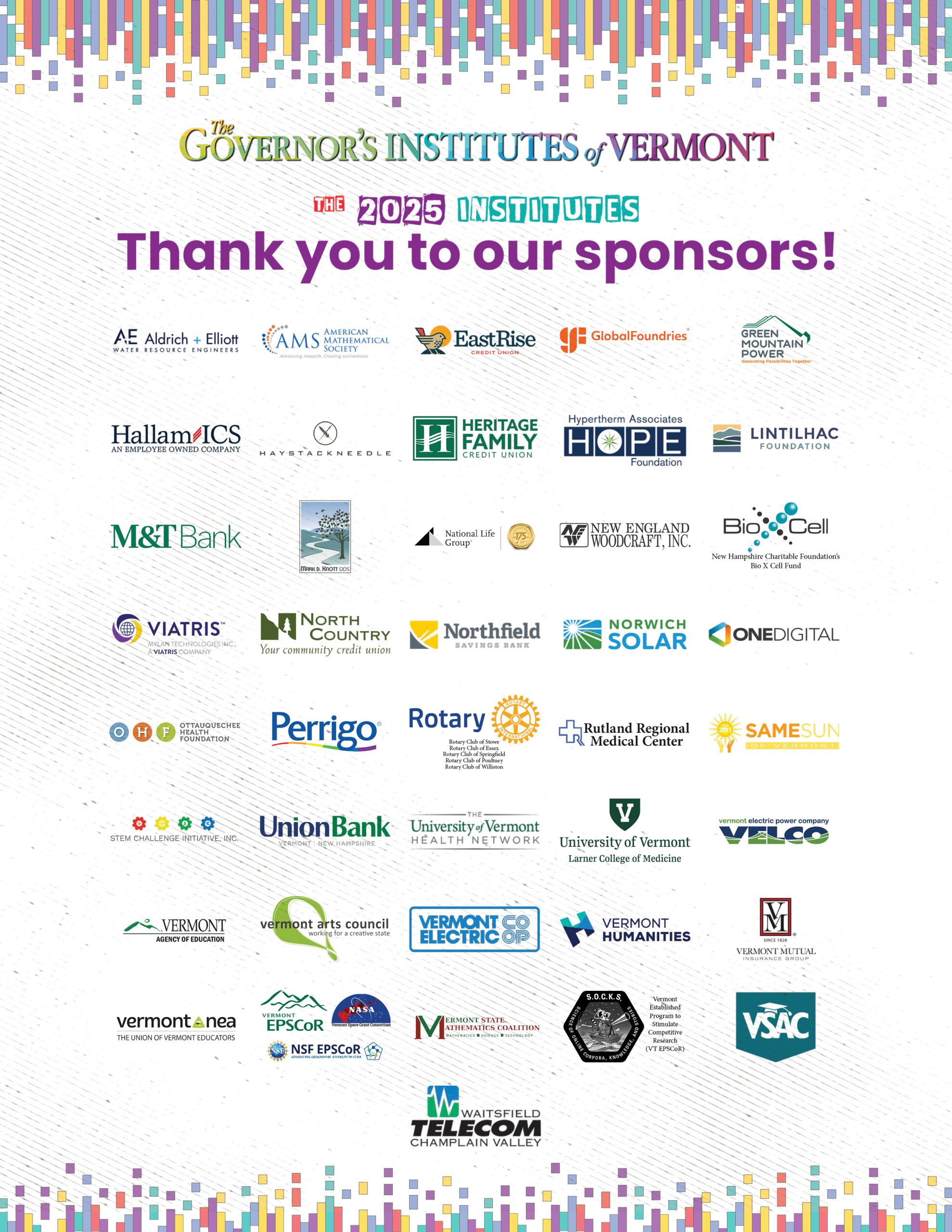 The Governor’s Institutes of Vermont (GIV) is made possible by the generous support of corporate, agency, and foundation sponsors, as well as individual donations. GIV greatly appreciates all of our sponsors for helping make these unique learning opportunities accessible for all young Vermonters.